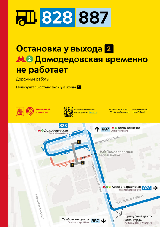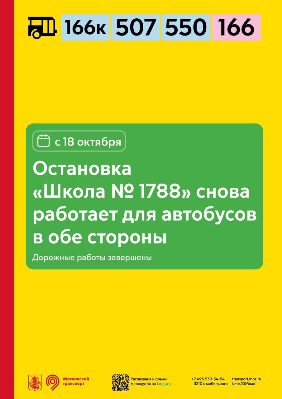 С 18 октября снова работает остановка «Школа № 1788» для автобусов 166, 166к, 507 и 550 в обе стороны — дорожные работы завершены. Временно не работает остановка у выхода 2 метро «Домодедовская» для автобусов 828 и 887 — проводятся дорожные работы. Пользуйтесь остановкой у выхода 1.