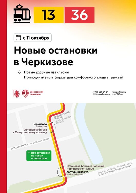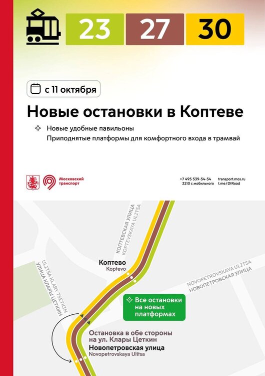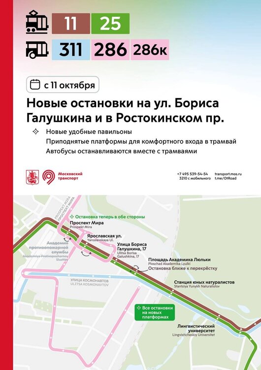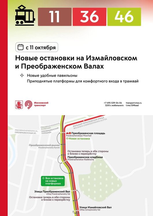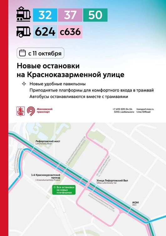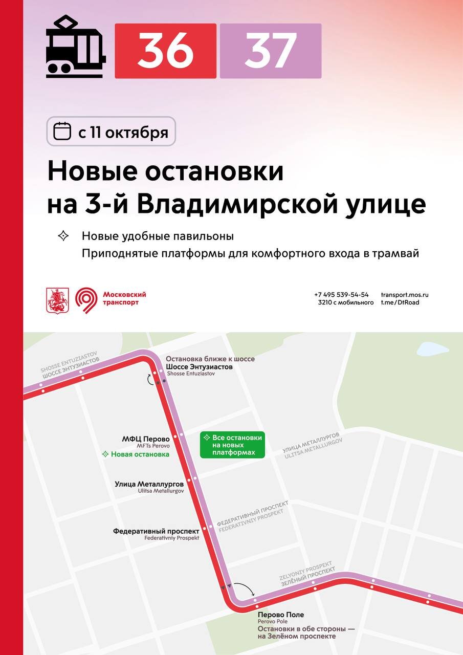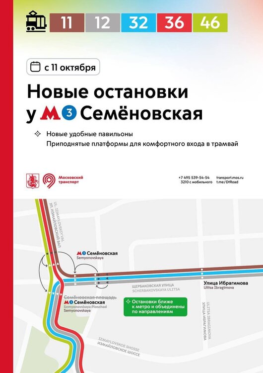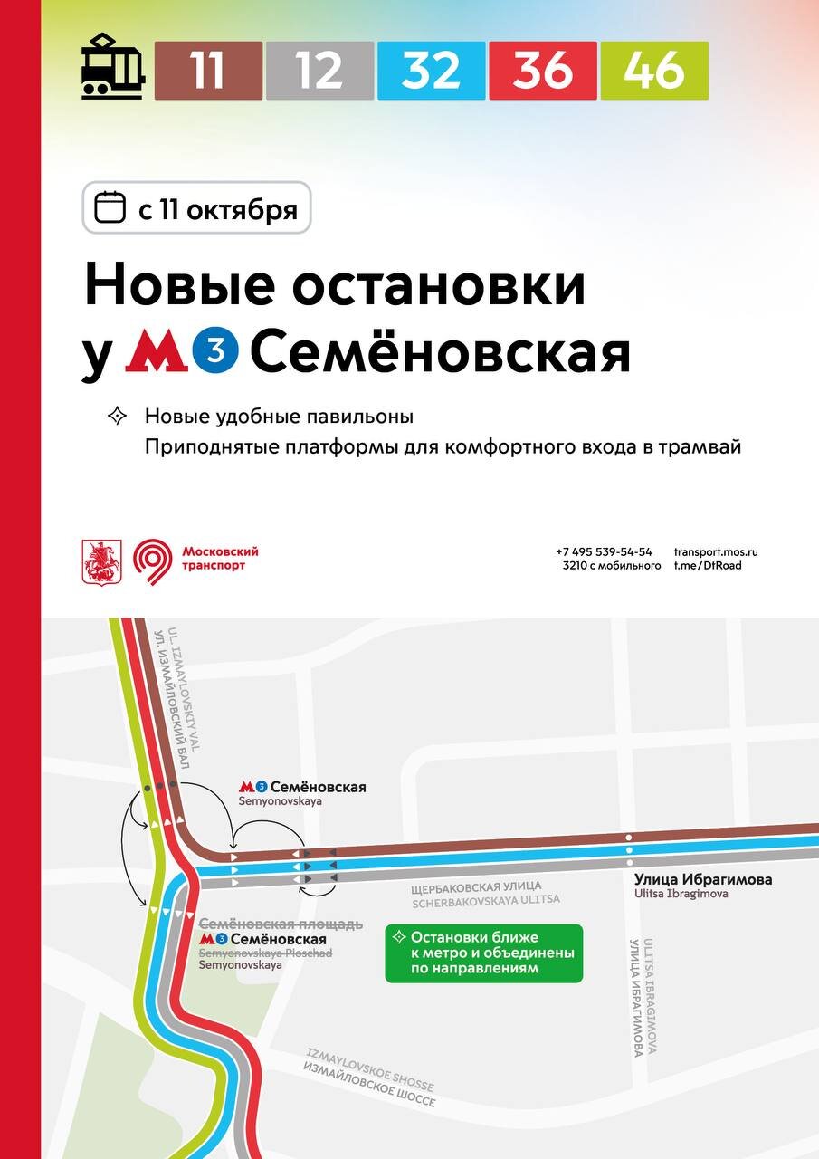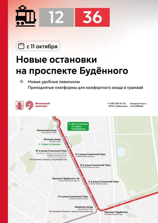 С 11 октября в разных районах города остановки трамваев и автобусов переносятся на новые приподнятые платформы. Новые остановки вводятся: 🔹на улице Бориса Галушкина и в Ростокинском проезде – для трамваев 11, 25 и автобусов 286, 286к, 311 🔹на Халтуринской улице – для трамваев 13, 36 🔹на Измайловском и Преображенском Валах – для трамваев 11, 36, 46 🔹у метро «Семёновская» – для трамваев 11, 12, 32, 36, 46 🔹на проспекте Будённого – для трамваев 12, 36 🔹на 3-й Владимирской улице – для трамваев 36, 37 🔹на Красноказарменной улице – для трамваев 32, 37, 50 и автобусов 624, с636 🔹в районе Коптево – для трамваев 23, 27, 30 На всех новых остановках оборудованы приподнятые платформы для комфортного входа в трамвай. Ранее многие остановки были расположены на проезжей части – теперь трамваи будут останавливаться у новых удобных платформ. На улице Бориса Галушкина, в Ростокинском проезде и на Красноказарменной улице остановки автобусов объединены с трамваями. Теперь весь транспорт, следующий в одном направлении, останавливается в единых местах. Новые остановки трамваев реализованы в рамках благоустройства столичных улиц.