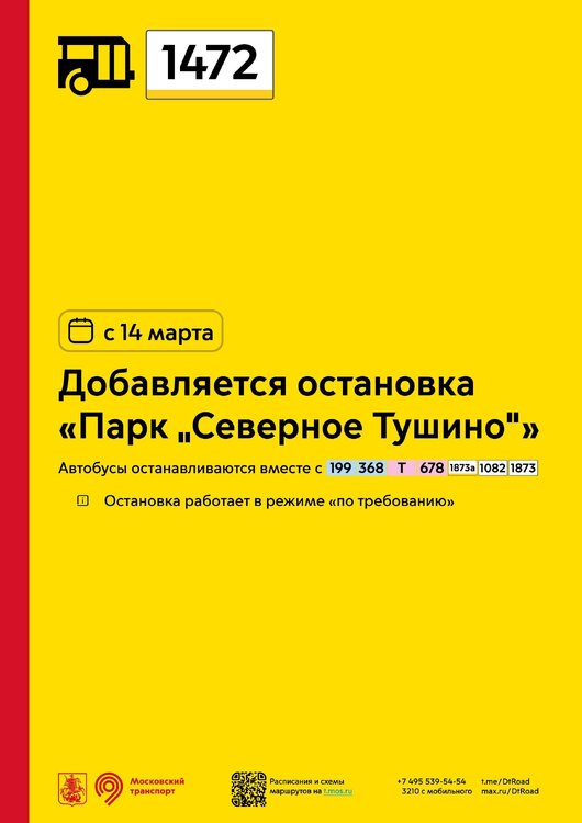 С 14 марта для пригородного маршрута 1472 добавляется остановка «Парк «Северное Тушино». Автобусы будут останавливаться там же, где автобусы городских маршрутов Т, 199, 368, 678, пригородного маршрута проекта «Москва — область» 1873а, а также областных маршрутов 1082 и 1873. Остановка будет работать в режиме «по требованию».