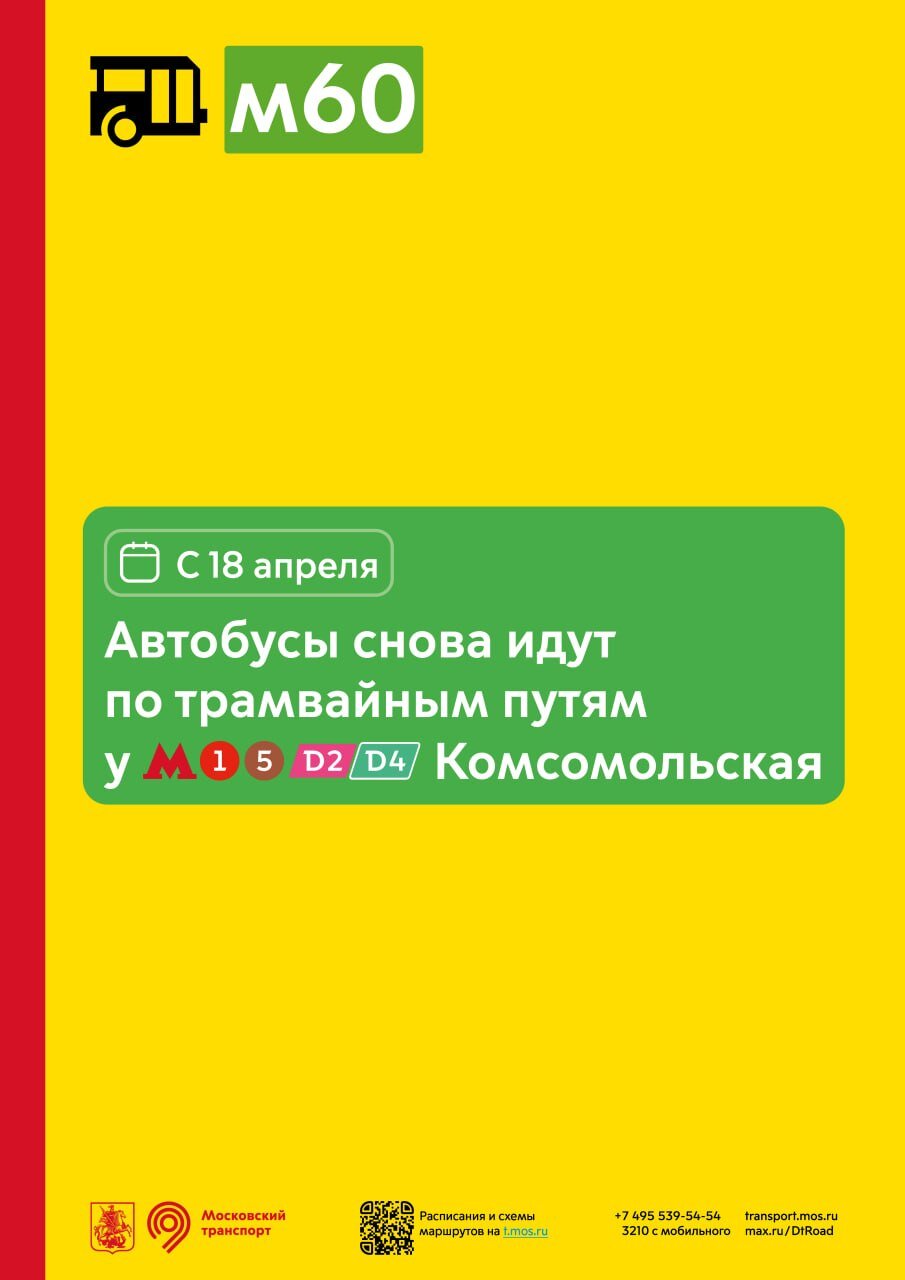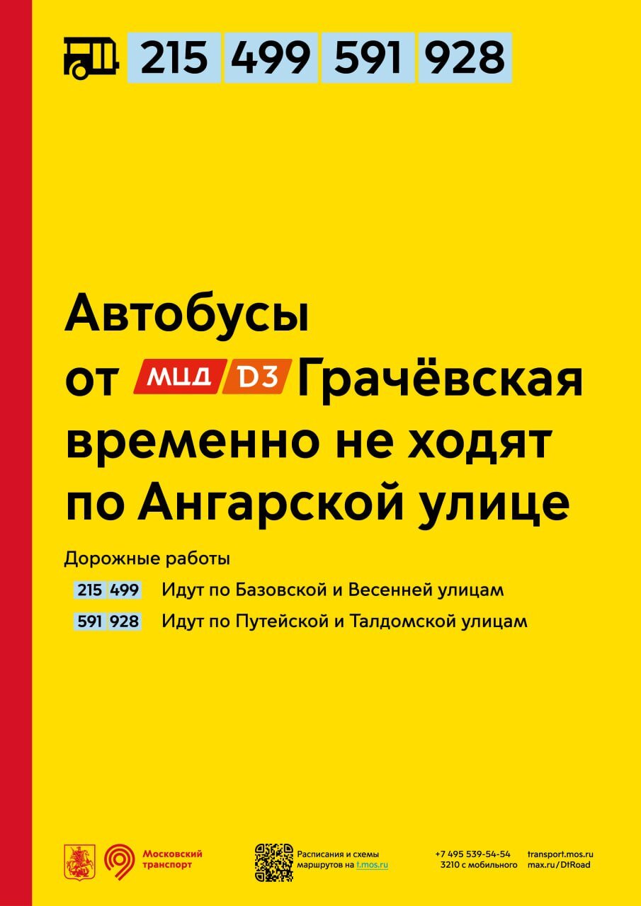 Автобусы 215, 499, 591 и 928 от МЦД Грачёвская временно не ходят по Ангарской улице. Автобусы 215 и 499 идут по Базовской и Весенней улицам, 591 и 928 — по Путейской и Талдомской улицам. Изменения — на время проведения дорожных работ. С 18 апреля автобусы м60 снова пойдут по трамвайным путям у метро «Комсомольская».