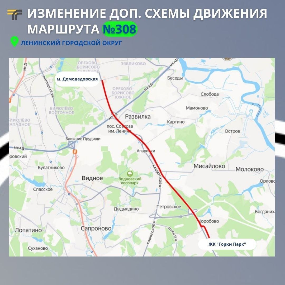 Gorky Park Горки Парк обзавелись заездом для некоторых рейсов 308. "Два автобуса совершают 44 рейса с заездом в ЖК: 🟡 первый — из ЖК в 05:30 🟡 последний — от метро Домодедовская в 00:00" https://t.me/dorogitransport/19571