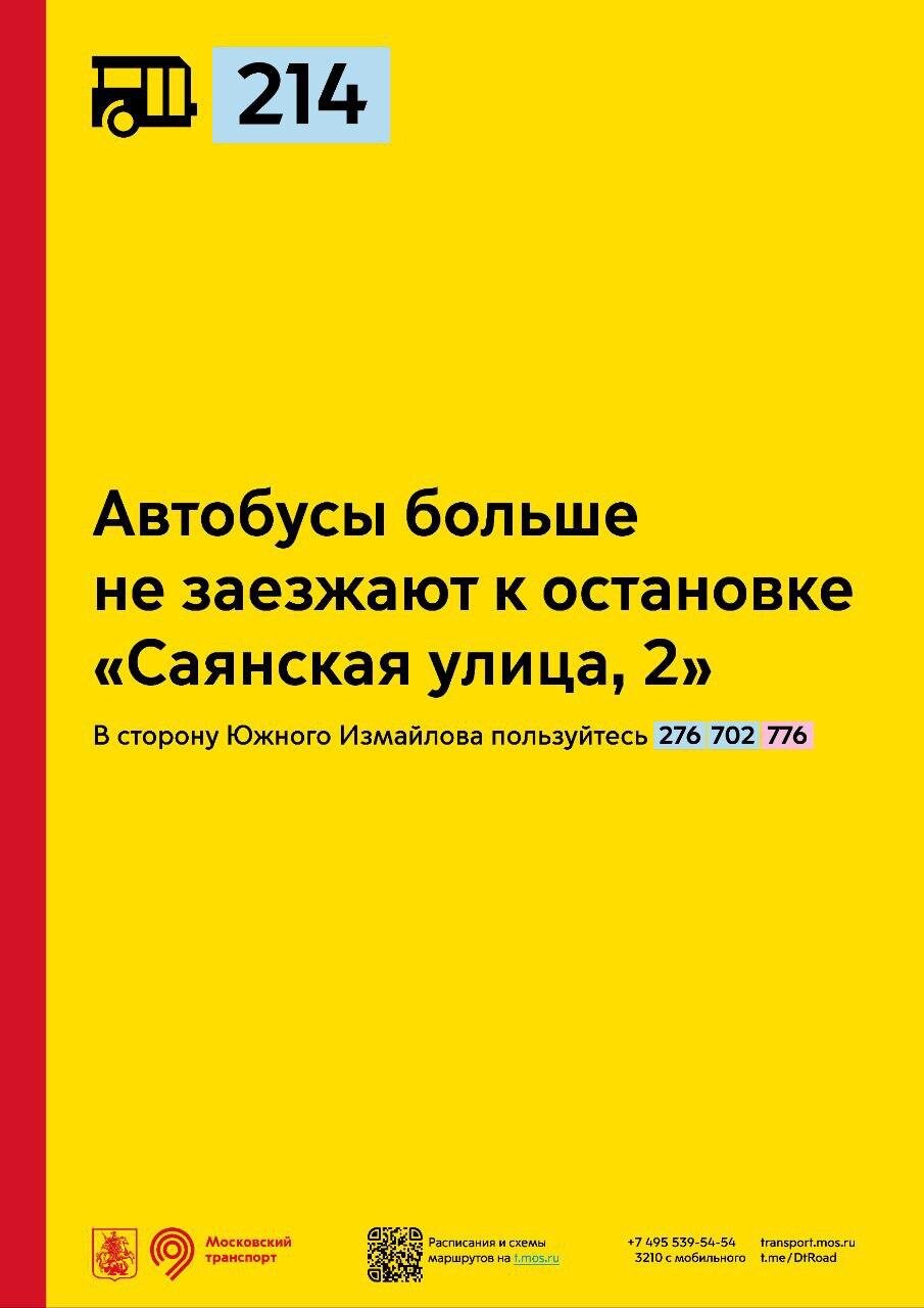 Автобусы 214 больше не заезжают к остановке «Саянская улица, 2». В сторону Южного Измайлова пользуйтесь автобусами 276, 702 и 776.