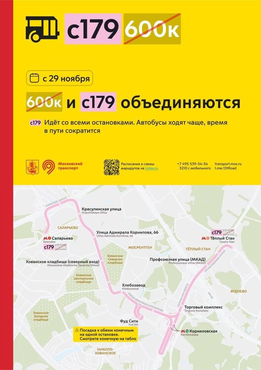 С 29 ноября объединяются маршруты с179 и 600к. Автобусы с179 пойдут со всеми остановками. Автобусы будут ходить чаще, время в пути сократится.