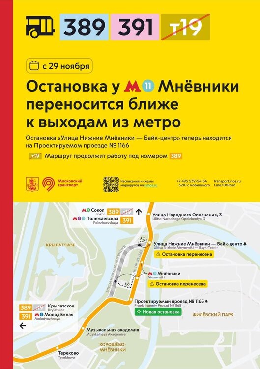 С 29 ноября остановка у метро «Мнёвники» переносится ближе к выходам из метро. Остановка «Улица Нижние Мнёвники — Байк-центр» теперь находится на Проектируемом проезде № 1166. Маршрут т19 продолжит свою работу под номером 389.