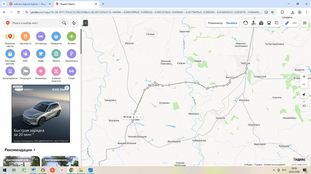 Но есть также дорога, которая проходит через Малые Борки, Александровку. Она немного короче основной и на скриншоте выделена отрезком функции "линейка".