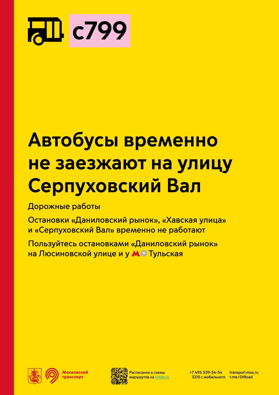 Автобусы с799 временно не заезжают на улицу Серпуховский Вал ― проводятся дорожные работы. Остановки «Даниловский рынок», «Хавская улица» и «Серпуховский Вал» временно не работают. Пользуйтесь остановками «Даниловский рынок» на Люсиновской улице и у станции метро «Тульская».