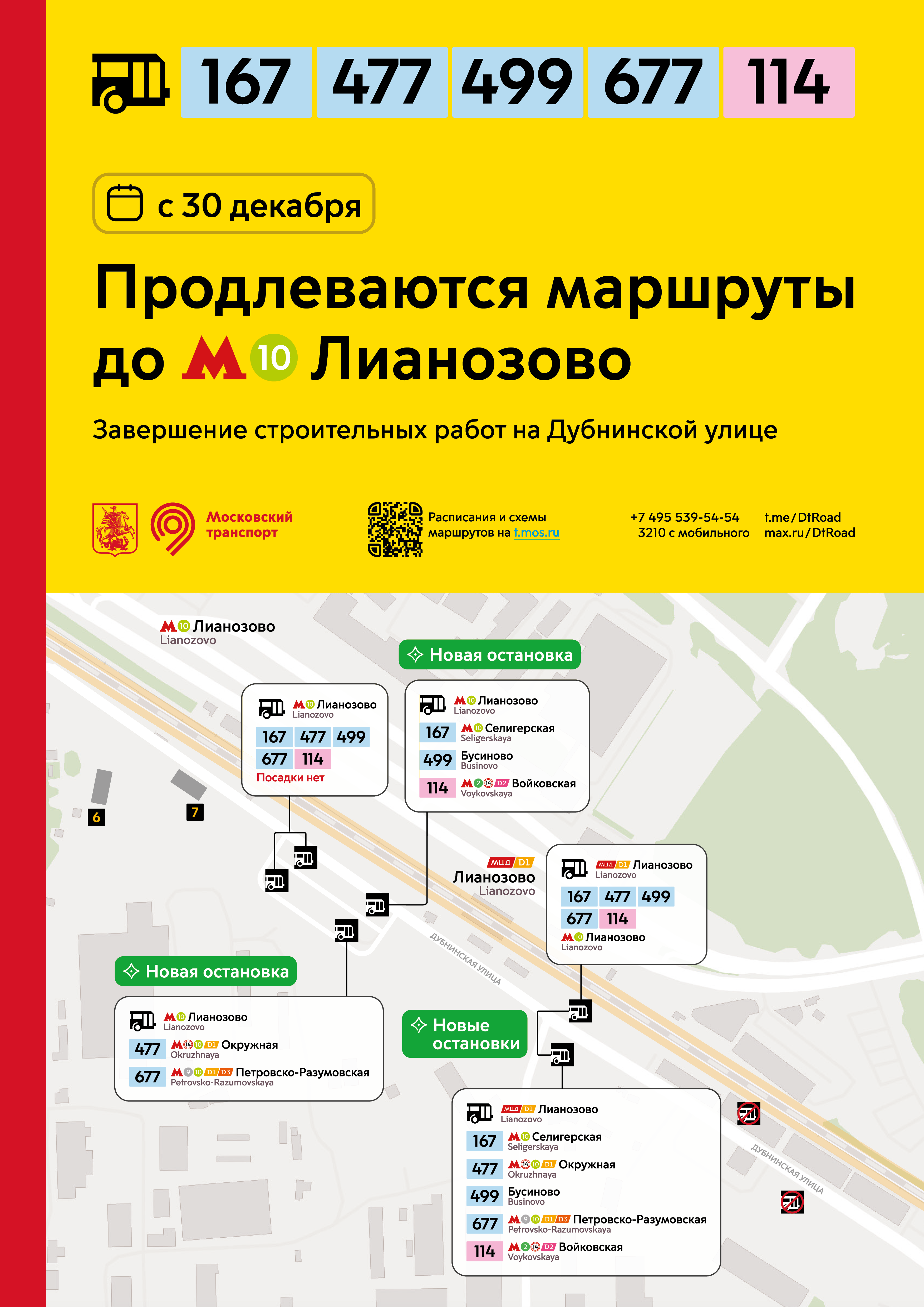 С 30 декабря маршруты 114, 167, 477, 499 и 677 продлеваются до метро «Лианозово» — завершаются строительные работы на Дубнинской улице. Странно что не по фэншую