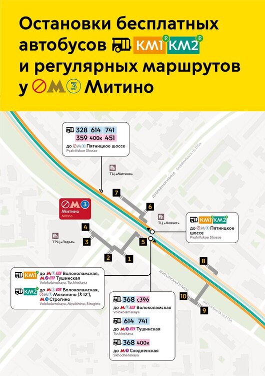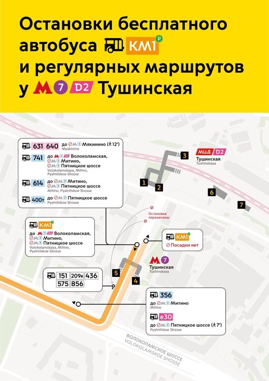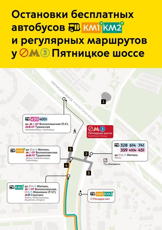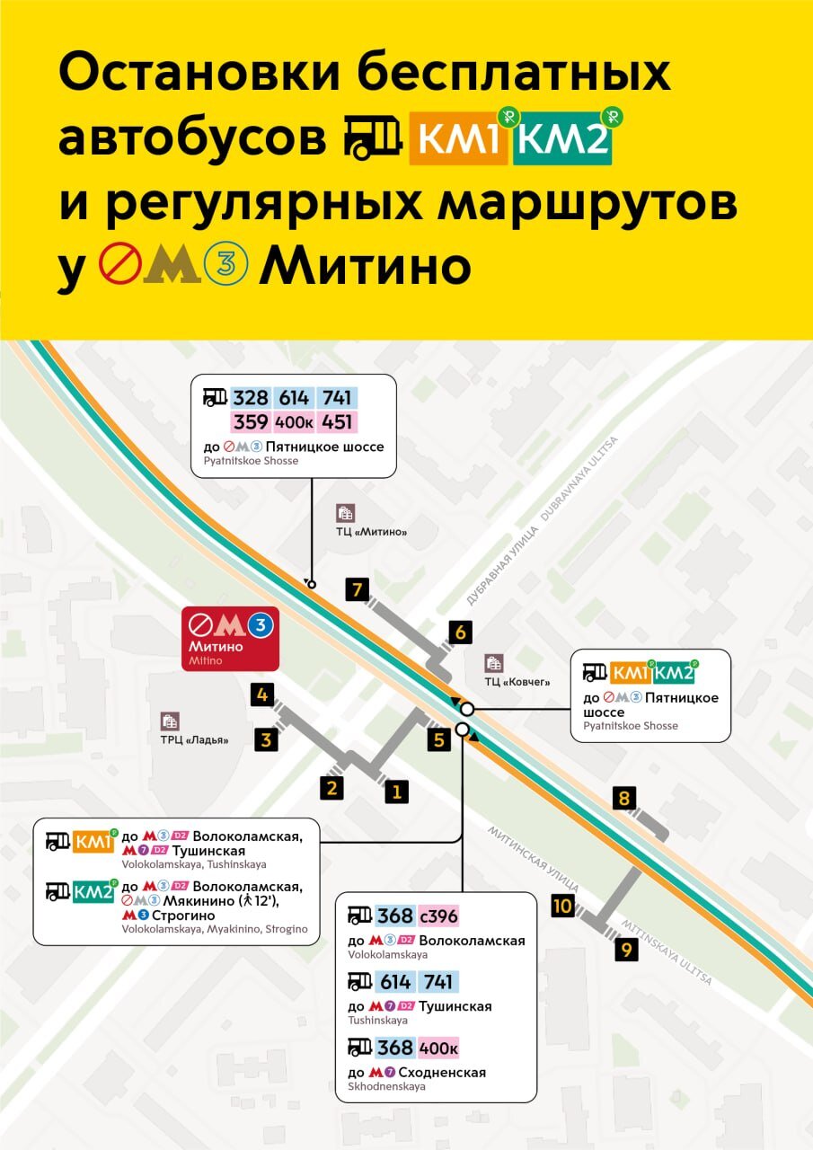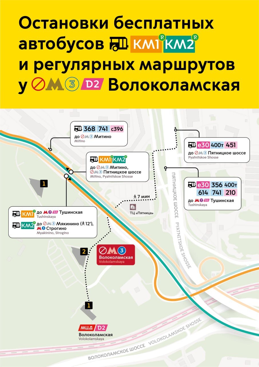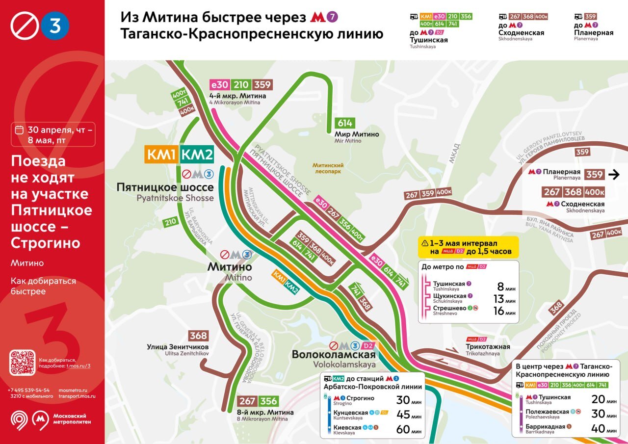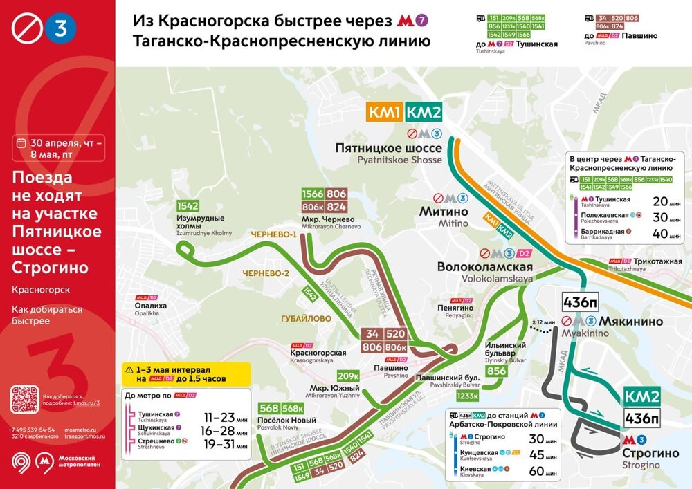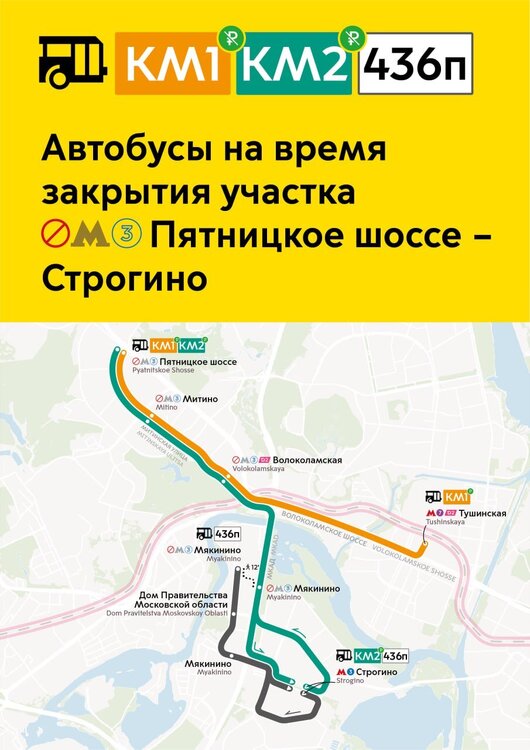 ‼️ С 30 апреля по 8 мая включительно не будет движения поездов на участке между станциями «Строгино» и «Пятницкое шоссе» Арбатско-Покровской линии в связи со строительством тоннеля Рублево-Архангельской линии. На время закрытия участка Арбатско-Покровской линии мы запустим автобусы КМ1 и КМ2. Они будут ходить с 5 часов утра до 2 часов ночи с остановками: КМ1: 🔹 Пятницкое шоссе 🔹 Митино 🔹 Волоколамская 🔹 Тушинская КМ2: 🔹 Пятницкое шоссе 🔹 Митино 🔹 Волоколамская 🔹 Мякинино 🔹 Строгино Мы запустим около 130 автобусов особо большого класса. Интервал — от 1 минуты. Помимо автобусов КМ, рекомендуем альтернативные маршруты: 🔹 Таганско-Краснопресненскую линию 🔹 автобусы е30к, е30, 614 и 210 будут усилены на время закрытия 🔹 другие маршруты наземного транспорта. Места остановок автобусов КМ1, КМ2 и другие альтернативные маршруты показываем в карточках. Пожалуйста, выбирайте альтернативные маршруты и планируйте ваши поездки заранее. Если вы пользуетесь станциями МЦД D2, пожалуйста, обратите внимание на изменения в расписании поездов. Подробнее узнать о закрытии можно здесь.