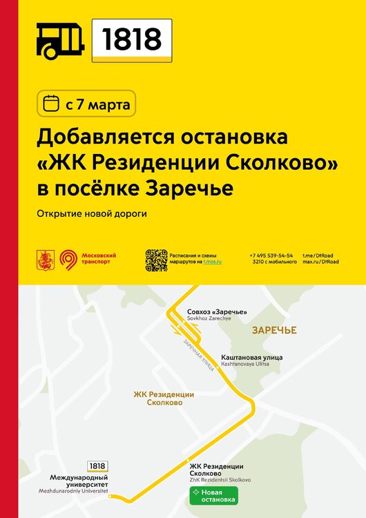 6. С 7 марта для пригородного маршрута 1818 добавляется остановка «ЖК Резиденции Сколково» в посёлке Заречье. Это стало возможным благодаря открытию новой дороги.