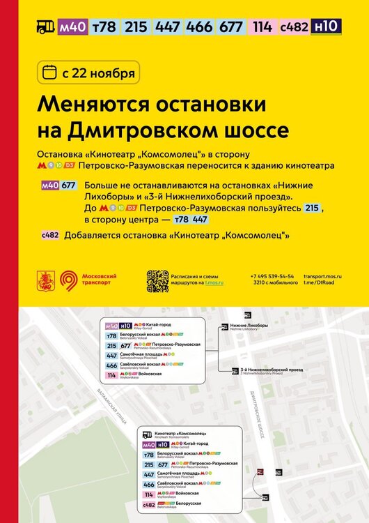 С 22 ноября меняются остановки на Дмитровском шоссе. Остановка «Кинотеатр «Комсомолец» в сторону метро «Петровско-Разумовская» переносится к зданию кинотеатра. Маршруты м40 и 677 больше не останавливаются на остановках «Нижние Лихоборы» и «3-й Нижнелихоборский проезд». До метро «Петровско-Разумовская» пользуйтесь маршрутом 215, в сторону центра — т78 и 447. Для маршрута с482 добавляется остановка «Кинотеатр «Комсомолец».