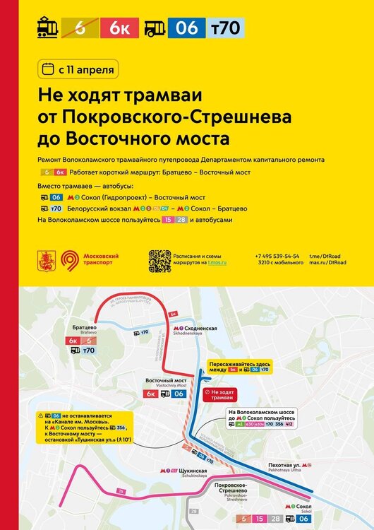 ⚠️ С 11 апреля трамваи временно не будут ходить от Покровского-Стрешнева до Восточного моста. Вместо маршрута трамвая 6 пользуйтесь коротким маршрутом 6к: Братцево — Восточный мост. Он будет работать ежедневно в течение всего дня. Также пользуйтесь автобусами: 🔹06 — от метро «Сокол» (Гидропроект) до Восточного моста 🔹т70 — от Белорусского вокзала через метро «Сокол» и «Сходненская» в Братцево Пересаживайтесь между трамваем 6к и автобусами 06, т70 на остановке «Восточный мост». На Волоколамском шоссе до метро «Сокол» также пользуйтесь трамваями 15, 28 и автобусами м1, е30, е30к, 356 и 412. Автобусы 06 не будут останавливаться на «Канале им. Москвы». К метро «Сокол» пользуйтесь автобусом 356, к Восточному мосту — остановкой «Тушинская улица». Начинаются работы с закрытием движения по Волоколамскому трамвайному путепроводу через железнодорожные пути МЦД-2. Планируется, что временные ограничения в движении трамваев будут действовать до середины мая. Это минимальный срок для такого масштабного ремонта. Работы выполняются столичным Департаментом капитального ремонта. Максим Ликсутов рассказал о том, что работа трамваев на наиболее востребованном участке в районах Северное Тушино и Южное Тушино будет сохранена. «Трамвайная инфраструктура требует своевременного обновления — это важно для обеспечения безопасных регулярных поездок. На время работ на Волоколамском шоссе мы запустим компенсационные автобусы, а также сохраним движение трамваев от остановки «Братцево» до Восточного моста, что позволит сохранить привычный маршрут к станции метро «Сходненская» для жителей прилегающих районов», — добавил Максим Ликсутов. Из-за особенностей сервисного обслуживания современных вагонов на маршрут 6к от остановки «Братцево» до Восточного моста временно выйдут трамваи предыдущего поколения с переменным уровнем пола. Современные вагоны «Витязь-Москва» вернутся на маршруты 6 и 6к после завершения строительных работ.