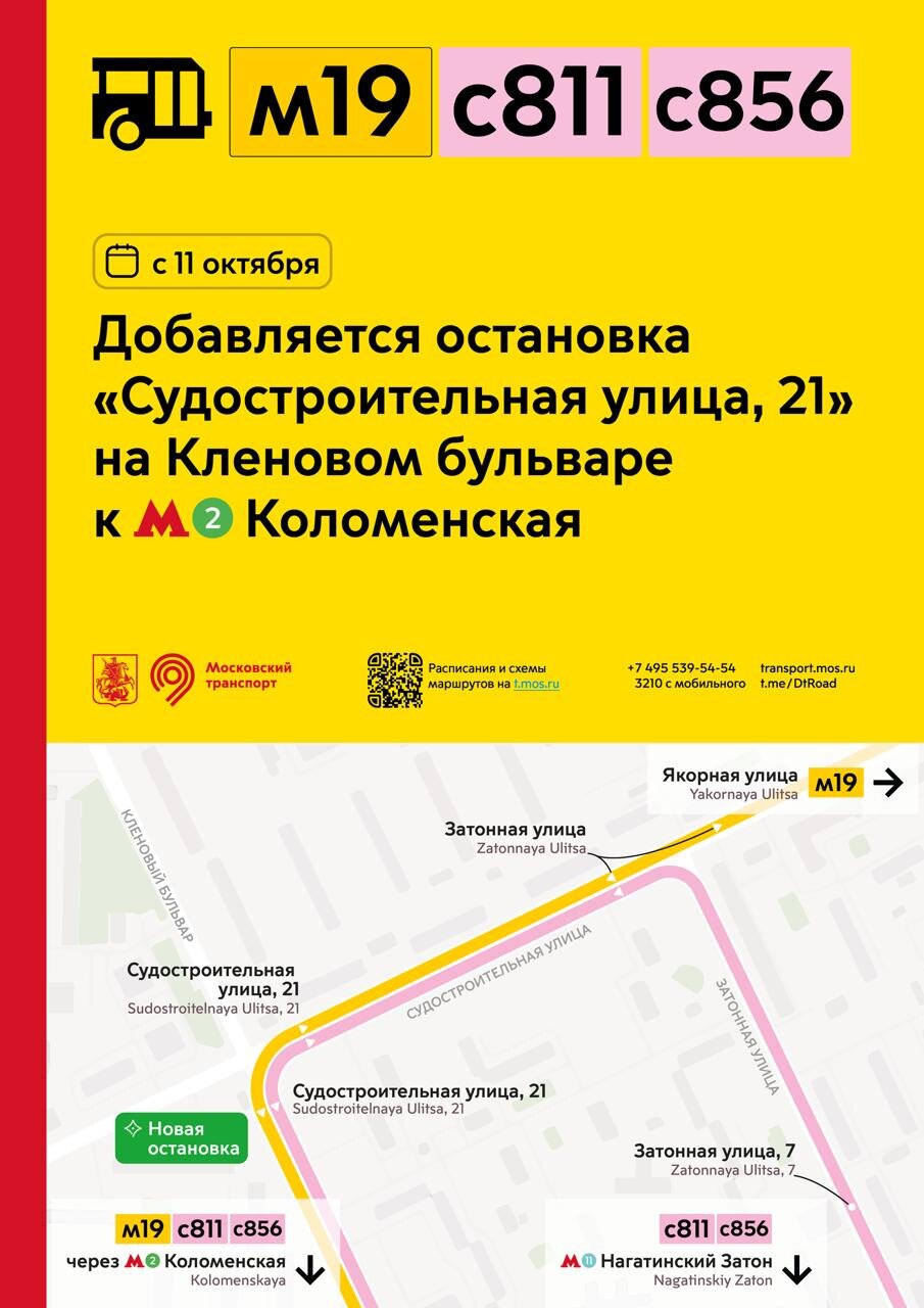 С 11 октября для автобусов м19, с811 и с856 добавляется остановка «Судостроительная улица, 21» на Кленовом бульваре к метро «Коломенская».