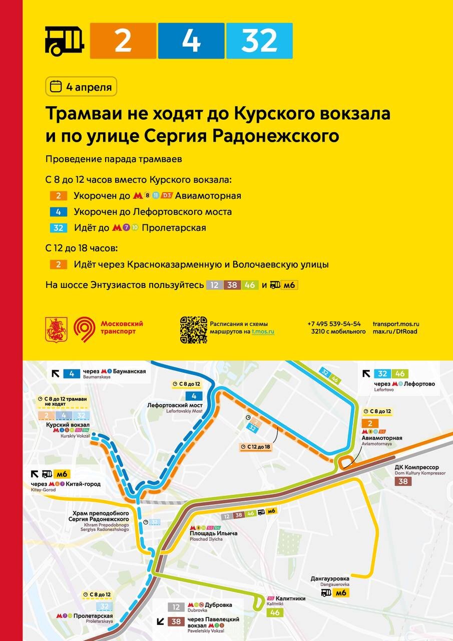 ⚠️ В субботу, 4 апреля, временно изменятся маршруты трамваев у Курского вокзала и на улице Сергия Радонежского. Максим Ликсутов рассказал, что на этом участке на время проведения Парада трамваев движение транспорта будет скорректировано. С 8:00 до 12:00 вместо Курского вокзала трамваи будут ходить: 🔹2 — от 3-й Владимирской улицы до метро «Авиамоторная» 🔹4 — от метро «Бульвар Рокоссовского» до Лефортовского моста 🔹32 — от метро «Партизанская» через Андроньевскую площадь и Абельмановскую Заставу до метро «Пролетарская» С 12:00 до 18:00 трамваи маршрута 2 вместо метро «Площадь Ильича» и улицы Сергия Радонежского поедут через Красноказарменную и Волочаевскую улицы. Пользуйтесь метро и МЦД, а на шоссе Энтузиастов — трамваями 12, 38 и 46, а также автобусом м6. «Мы подготовили большой праздник для жителей и гостей столицы. В эту субботу проведем 21-й Парад трамваев. По улицам города проедут 16 вагонов разных поколений, а на выставке ретротранспорта посетители смогут увидеть более 50 исторических экспонатов. Всех ждем!» — добавил Максим Ликсутов.
