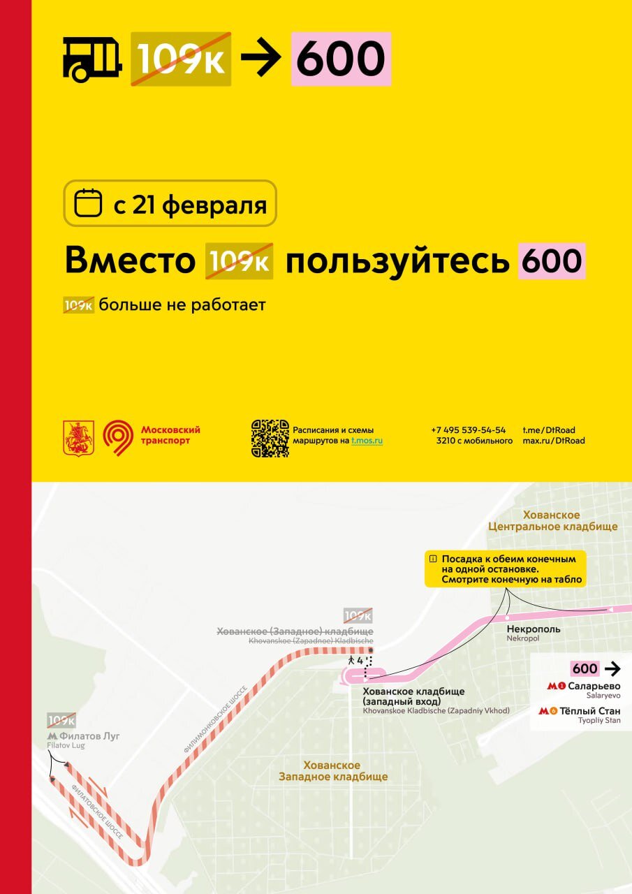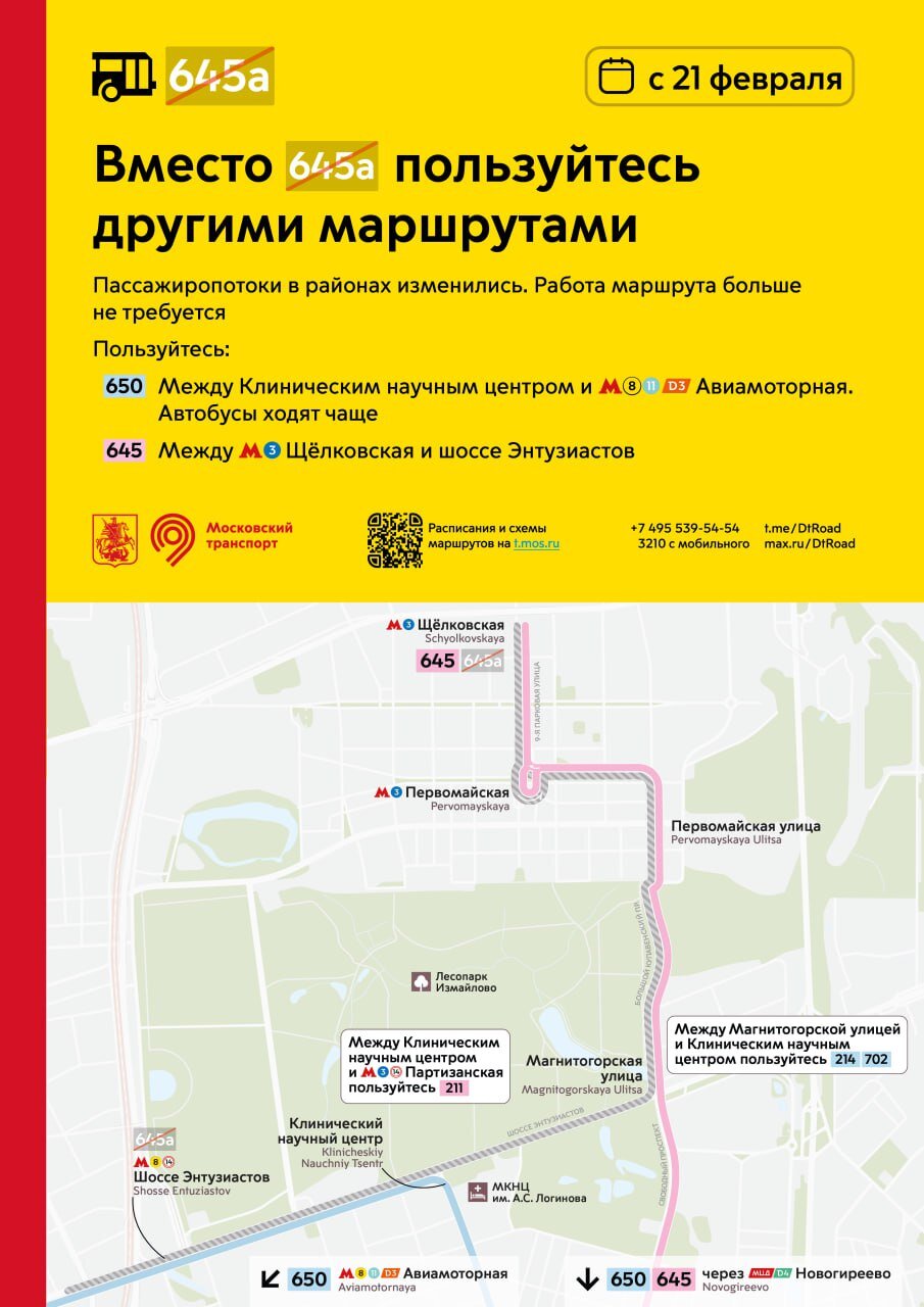 С 21 февраля вместо маршрута 645а пользуйтесь другими маршрутами: 650 — между Клиническим научным центром и метро «Авиамоторная». Автобусы будут ходить чаще. 645 — между метро «Щелковская» и шоссе Энтузиастов. Пассажиропотоки в районах изменились. Работа маршрута 645а больше не требуется.