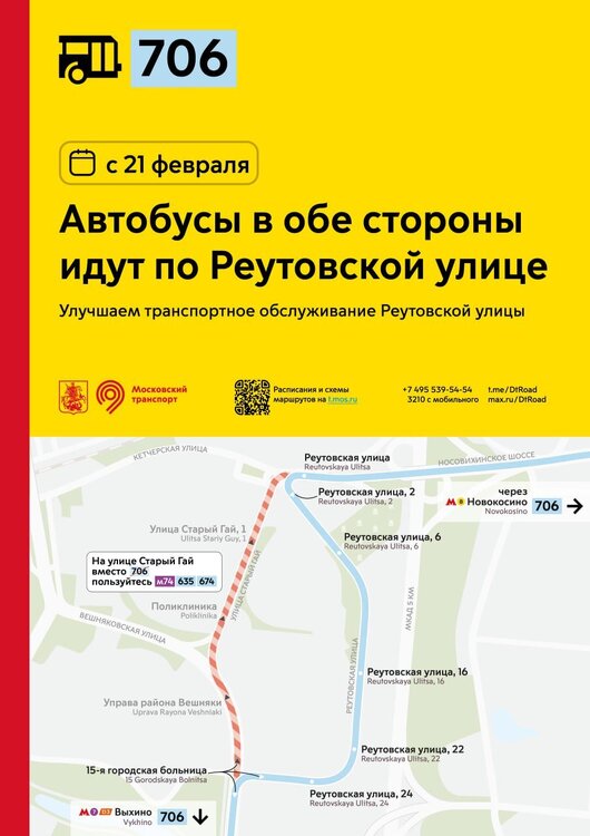 С 21 февраля автобусы 706 пойдут в обе стороны по Реутовской улице. Это необходимо для улучшения транспортного обслуживания Реутовской улицы.