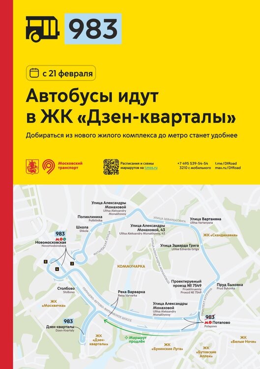 С 21 февраля автобусы 983 пойдут в ЖК «Дзен-кварталы». Добираться из нового жилого комплекса до метро станет удобнее.