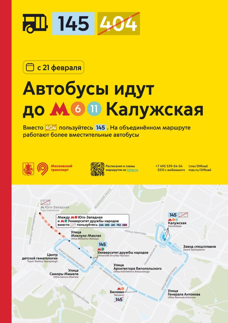 С 21 февраля автобусы 145 пойдут до метро «Калужская». Вместо маршрута 404 пользуйтесь 145. На объединенном маршруте будут работать более вместительные автобусы.