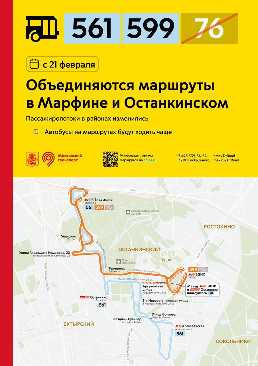 С 21 февраля объединяются маршруты 76 и 561 в Марфине и Останкинском. Пассажиропотоки в районах изменились. Автобусы на объединенном маршруте 561 и маршруте 599 будут ходить чаще.