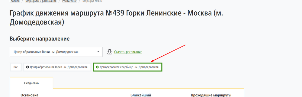 А понятно, надо было для этого нажать в меню на "Метро Домодедовская - Центр образования Горки". В этом есть некоторый минус в том, что на сайте МТА можно посмотреть только расписание по остановкам, а на карте, если маршрут указан, можно посмотреть схему движения, глядя на которую можно увидеть, какие остановки, из встречающихся на пути маршрута, значатся не обслуживаемыми, в случае если таковые остановки на данном маршруте имеются.