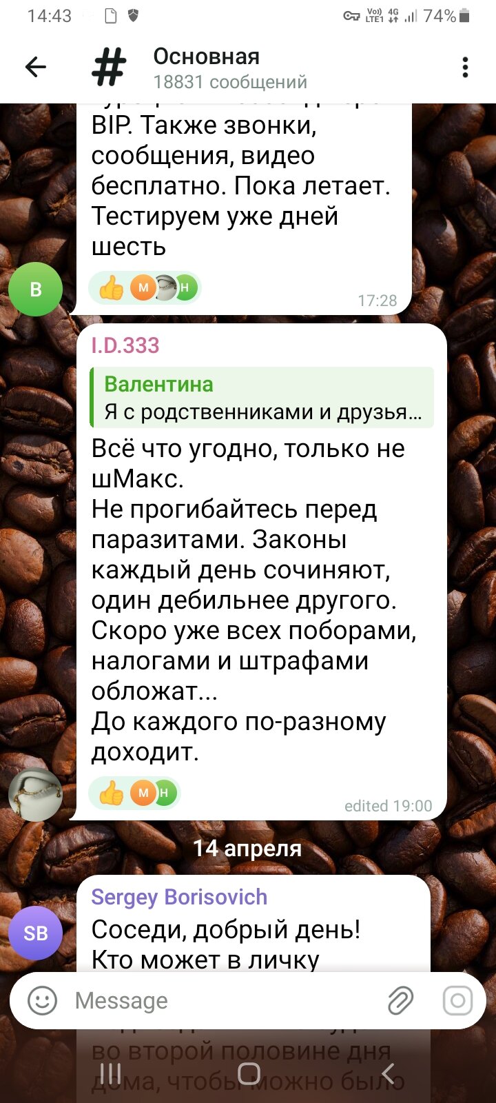 Вот один адекватный гражданин из нашего домового чата в гТГ. Что хотел аргументировать я не понял.. Понятно, что там 3-4 человека остались и бесятся...