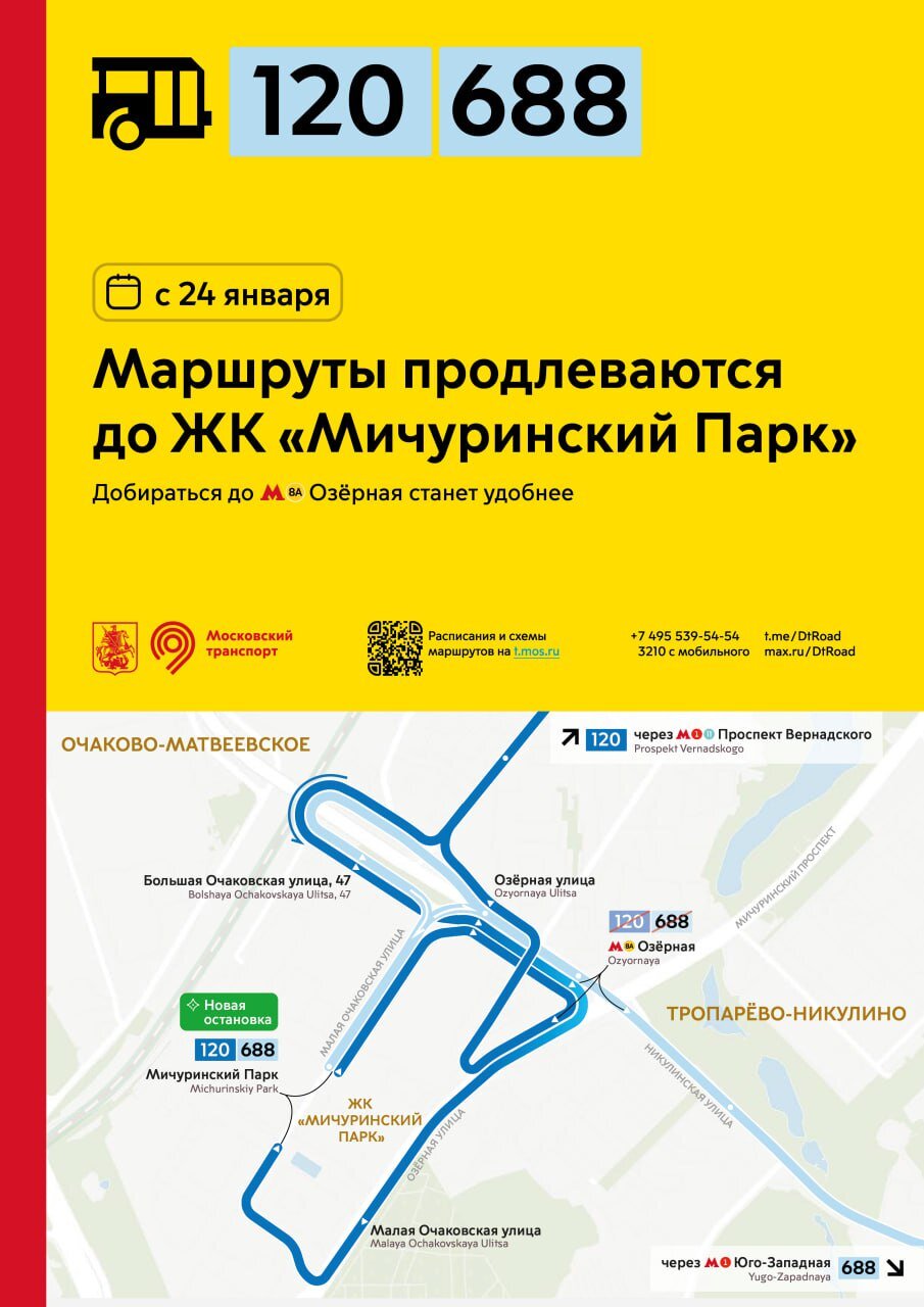 С 24 января маршруты 120 и 688 продлеваются до ЖК «Мичуринский Парк». Добираться до метро «Озёрная» станет удобнее.