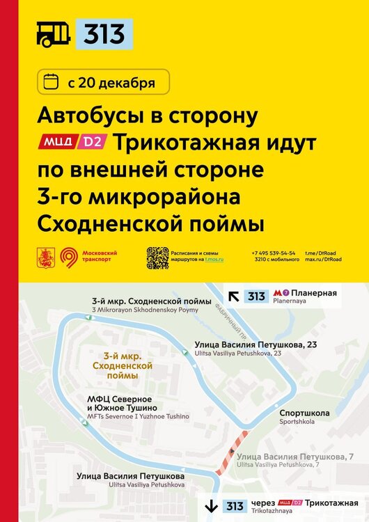 С 20 декабря автобусы 313 в сторону МЦД Трикотажная пойдут по внешней стороне 3-го микрорайона Сходненской поймы. Как по мне, действительно хорошее изменение.