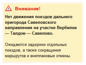 Слышал, прекращено движение поездов где то в Талдоме, из-за погоды.