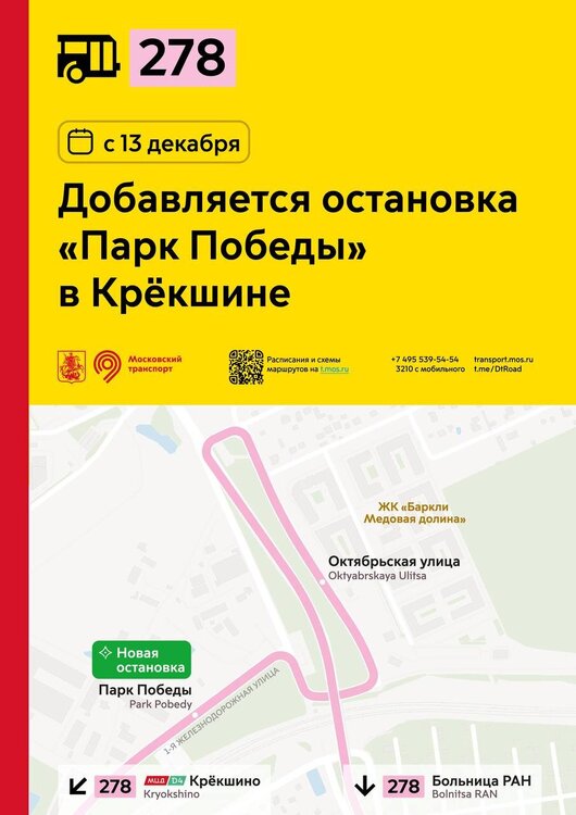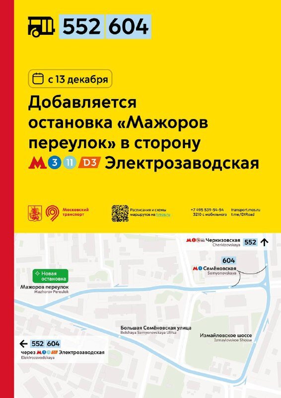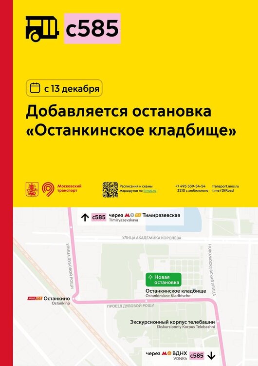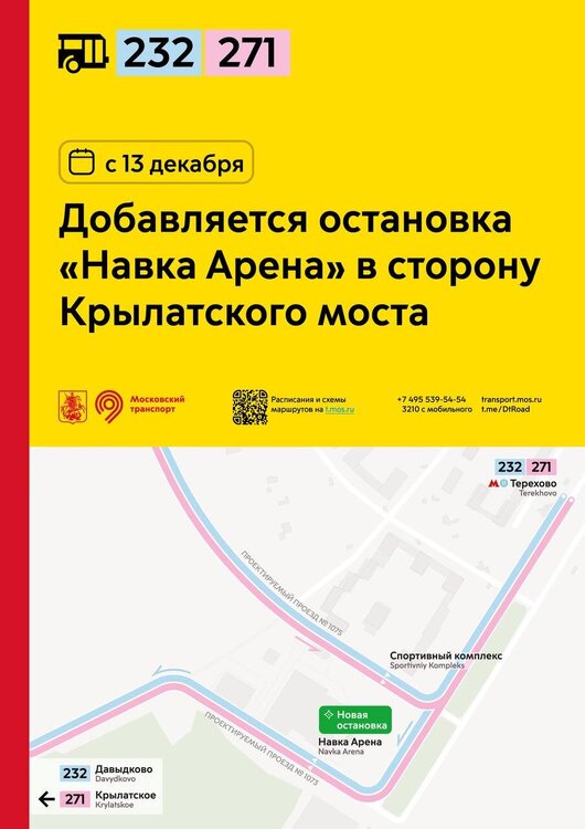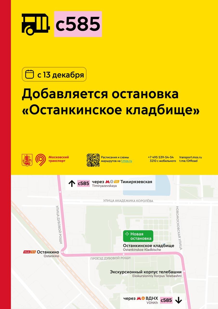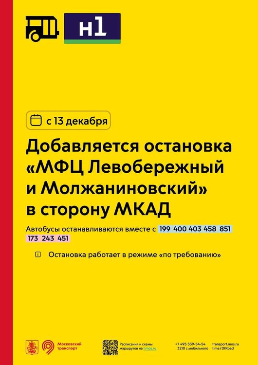 С 13 декабря добавляется остановка «Мажоров переулок» в сторону метро «Электрозаводская» для маршрутов 552 и 604. С 13 декабря добавляется остановка «МФЦ Левобережный и Молжаниновский» в сторону МКАД для ночного маршрута н1. Автобусы будут останавливаться там же, где автобусы маршрутов 173, 199, 243, 400, 403, 451, 458 и 851. Остановка будет работать в режиме «по требованию». С 13 декабря добавляется остановка «Навка Арена» в сторону Крылатского моста для маршрутов 232 и 271. С 13 декабря добавляется остановка «Останкинское кладбище» для маршрута с585. С 13 декабря для маршрута 278 добавляется остановка «Парк Победы» в Крёкшине.1 балл