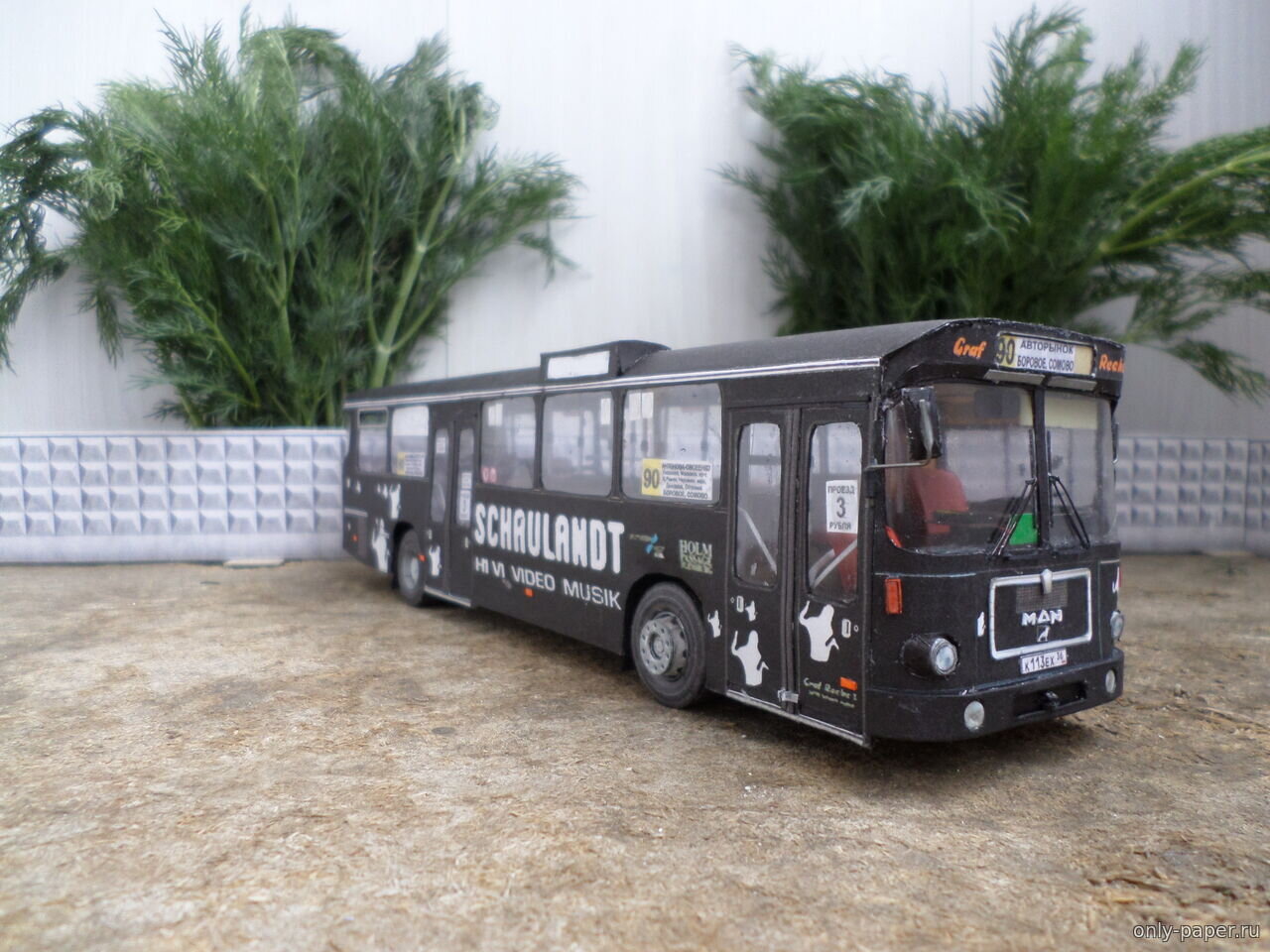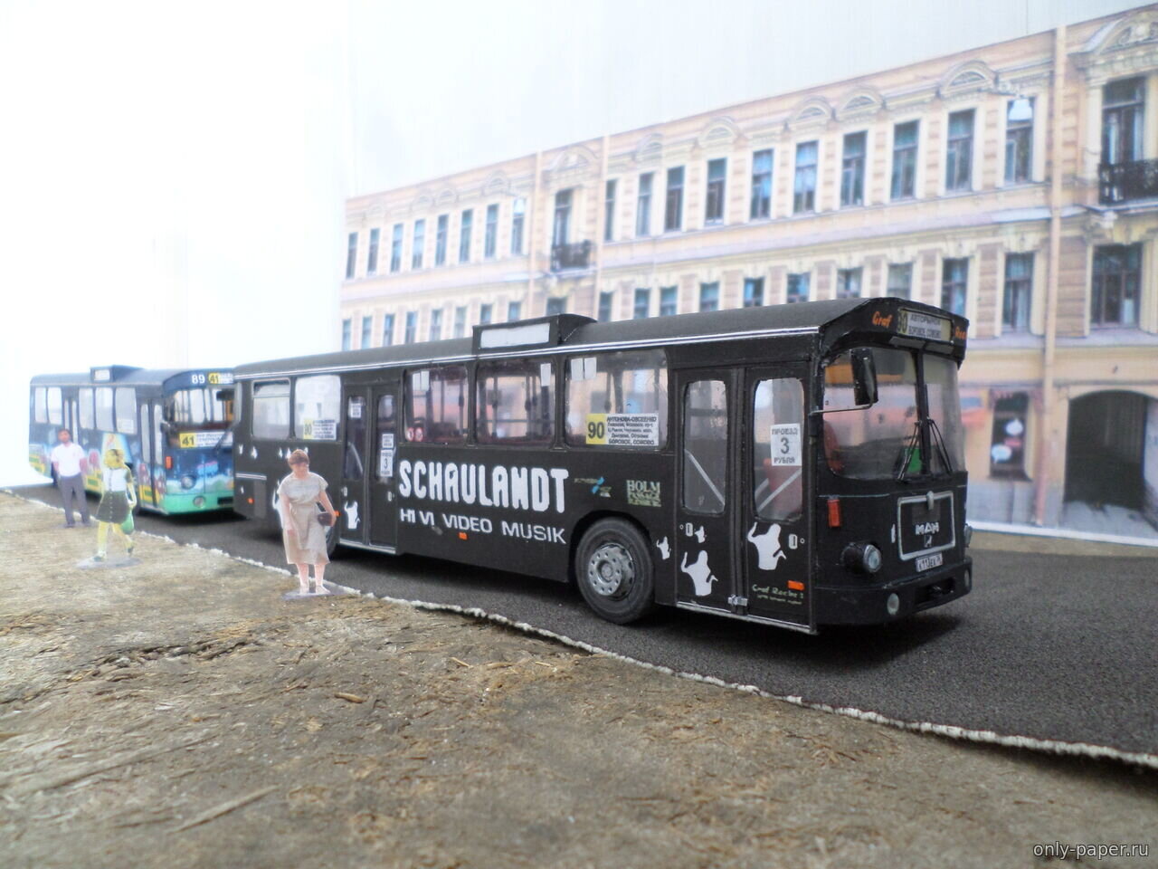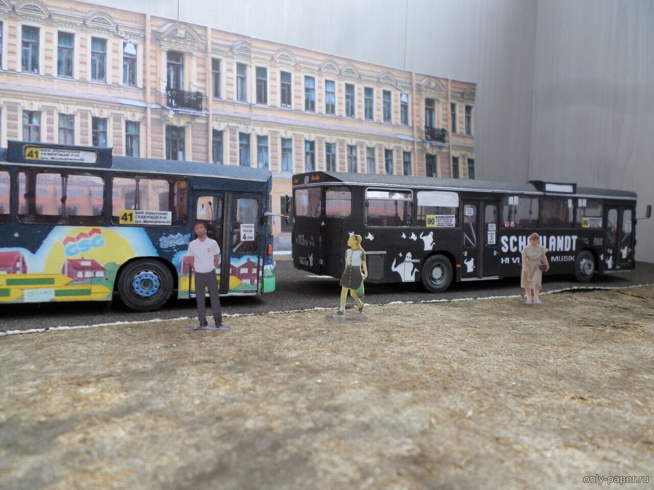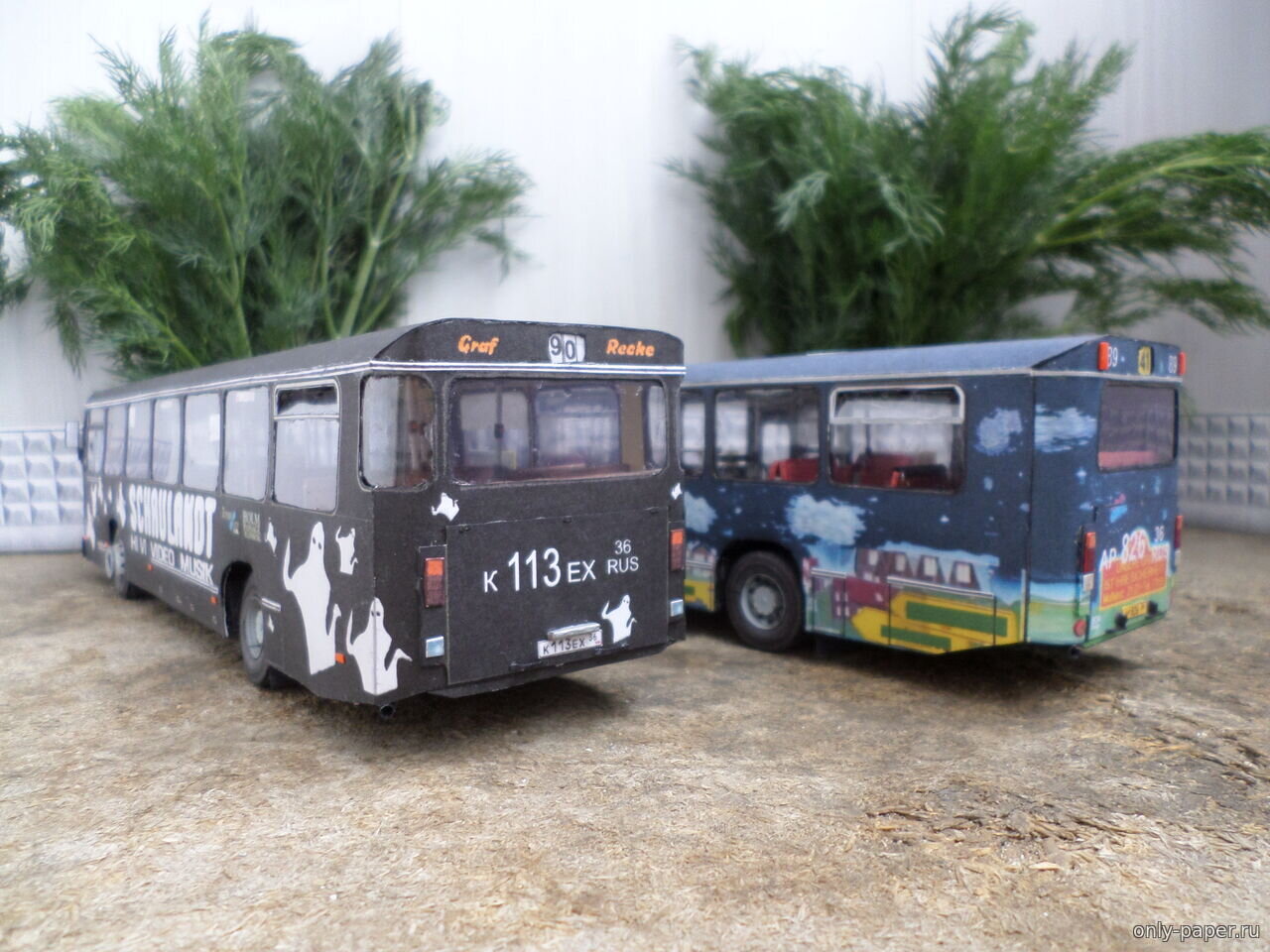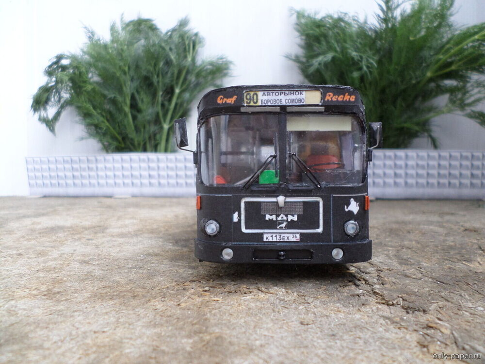 MAN 192 SL200 "Каспер" . Масштаб 1:43. Материал - бумага плотностью 200гр/м2. В Воронеже такой катался в 2002 году, потом, при переходе на жёлтые номера наклейки с привидениями отодрали (во время прохождения техосмотра в ГАИ) . Так этот автобус выглядел в Воронеже в 2005 году (уже без приведений) : https://fotobus.msk.ru/photo/1292943/ А вот он ещё с приведениями, но ещё в Германии (2001год) : https://fotobus.msk.ru/photo/1592786/ Процесс сборки в мастерской : https://only-paper.ru/forum/33-32510-708859-16-1771169667 Обзорное видео: https://vk.com/video890555898_456239062 Лето 2002-го года... Автобус стоит в ПАТП : Вид снизу незатейлив: А вот таким получилось место водителя в модели: Пассажирский салон: Два MAN 192 SL200 стоят в ПАТП : Лето 2002 года... MAN 192 SL200 на маршруте:2 балла