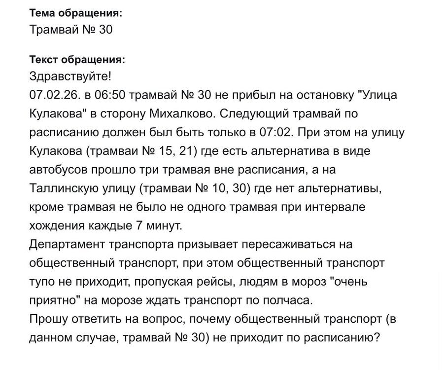 И как это понимать? я наверно слепой и не увидел трамвай, пришедший на остановку в 6:52… А то, что на Кулакова пошли три подряд вместо Таллинской, наверно мне почудилось