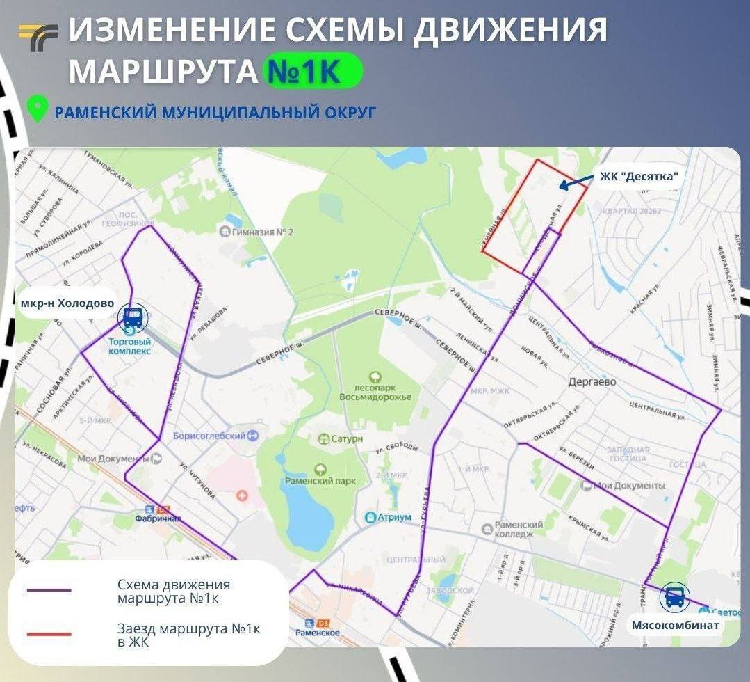 В Раменском округе изменили схему движения маршрута №1к "м/р Холодово – ДК «Орбита» – Мясокомбинат". Автобусы маршрута теперь совершают заезд в ЖК «Десятка» тыц
