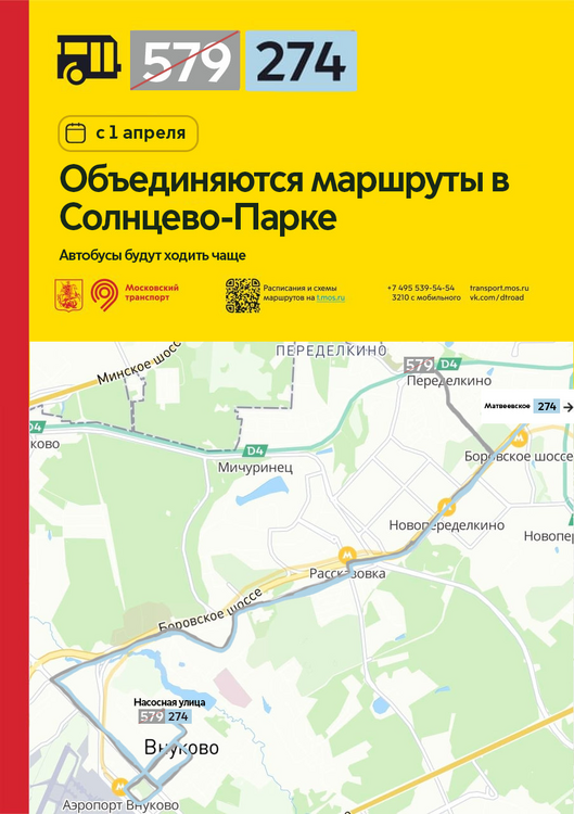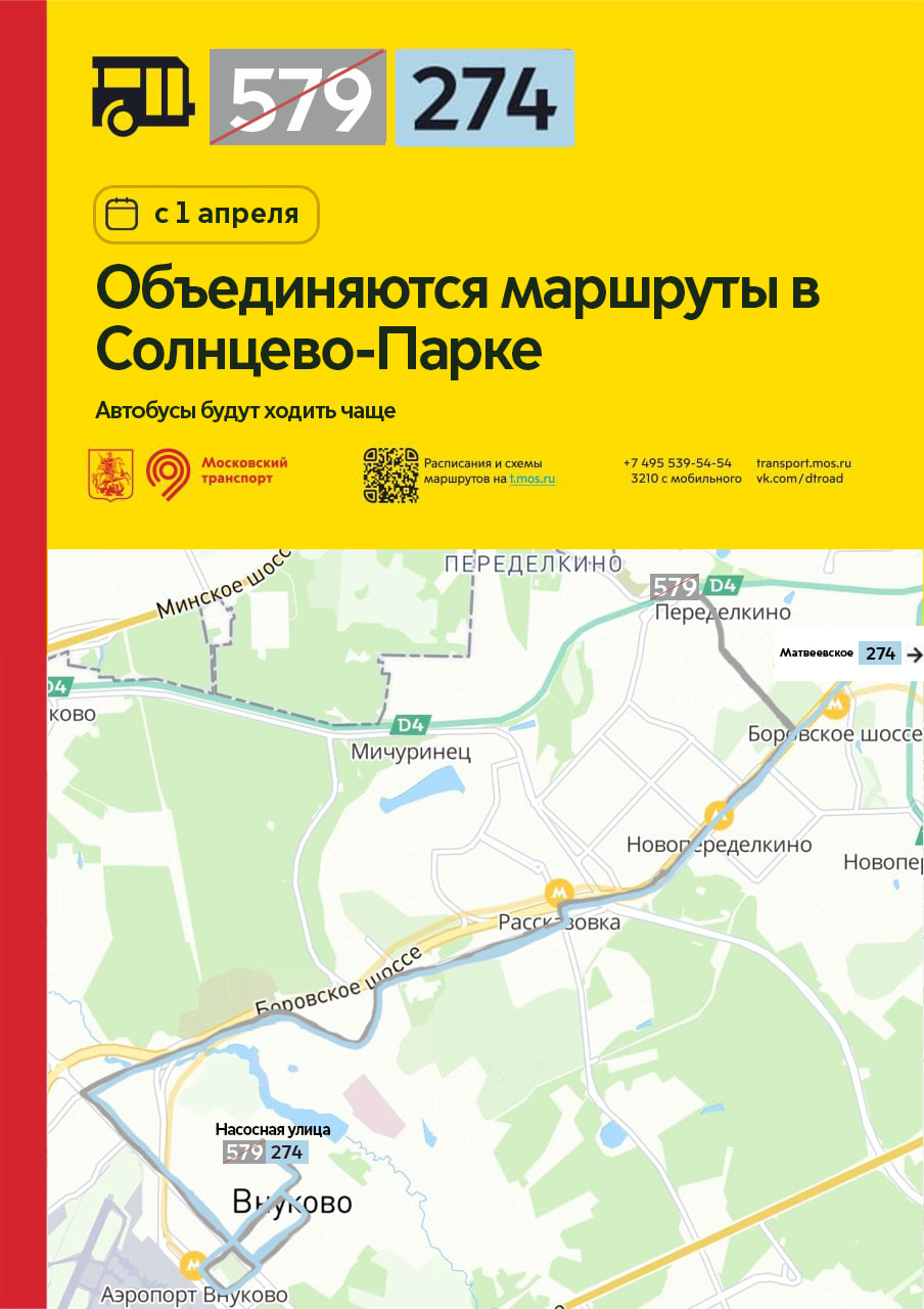 Закину сюда же 😁 . С 1 апреля объединяются маршруты в Солнцево-Парке: 🔹 Вместо 579 пользуйтесь 274. Он идёт до Насосной улицы через Аэропорт Внуково Автобусы будут ходить чаще.