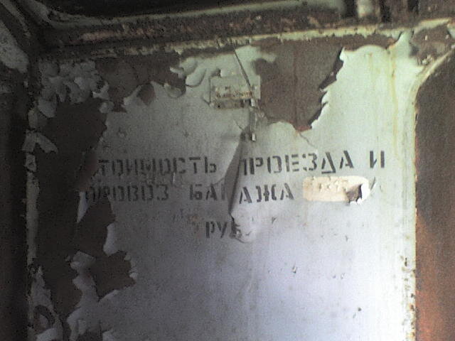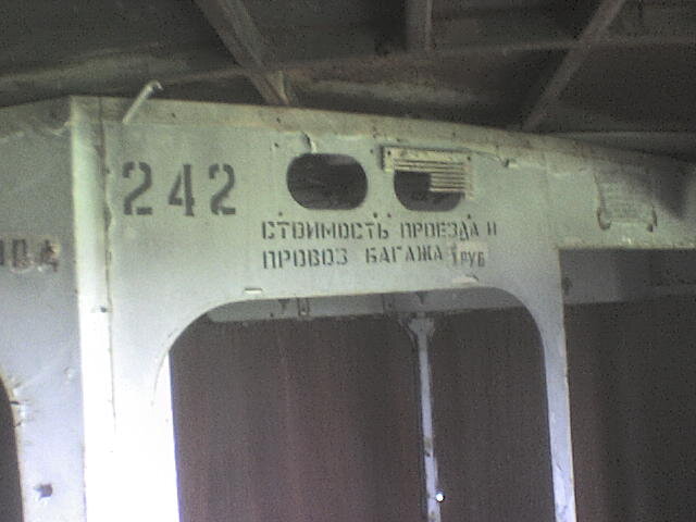 Также где поручень крепился на перегородку  обнаружил остатки  надписи стоимость проезда пассажира 10 копеек.
