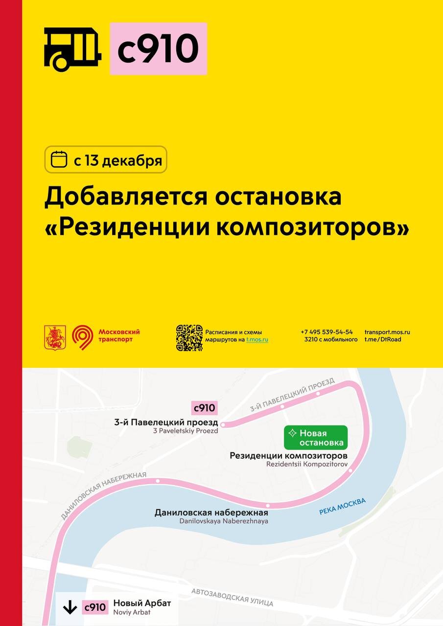 Anomim Опубликовано 1 час назад Поделиться Опубликовано 1 час назад С 13 декабря добавляется остановка «Резиденции композиторов» для маршрута с910. Ссылка на комментарий Поделиться на другие сайты Поделиться