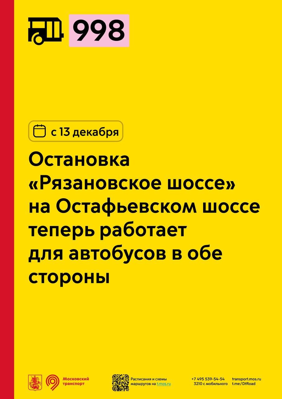 Anomim Опубликовано 1 час назад Поделиться Опубликовано 1 час назад С 13 декабря остановка «Рязановское шоссе» на Остафьевском шоссе теперь будет работать для автобусов маршрута 998 в обе стороны. Ссылка на комментарий Поделиться на другие сайты Поделиться