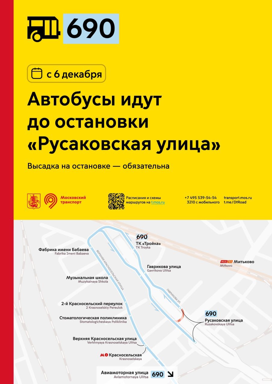 Anomim Опубликовано Четверг в 14:16 Поделиться Опубликовано Четверг в 14:16 С 6 декабря автобусы 690 пойдут до остановки «Русаковская улица». Высадка на остановке — обязательна. Ссылка на комментарий Поделиться на другие сайты Поделиться