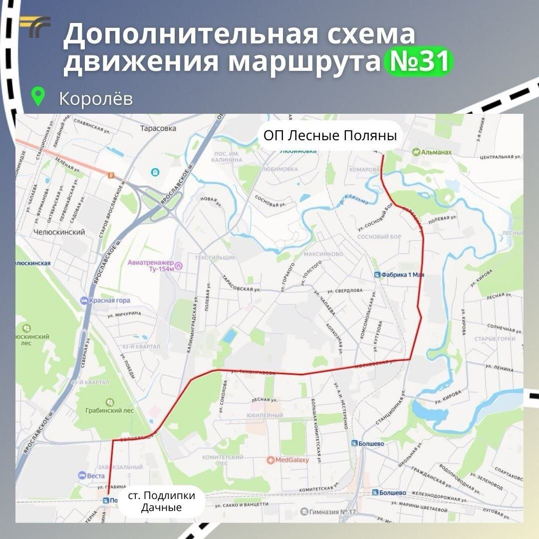 Для жителей г.о. Королёв запустили дополнительную схему движения маршрута №31 "Лесные Поляны — ст. Болшево — ст. Подлипки".